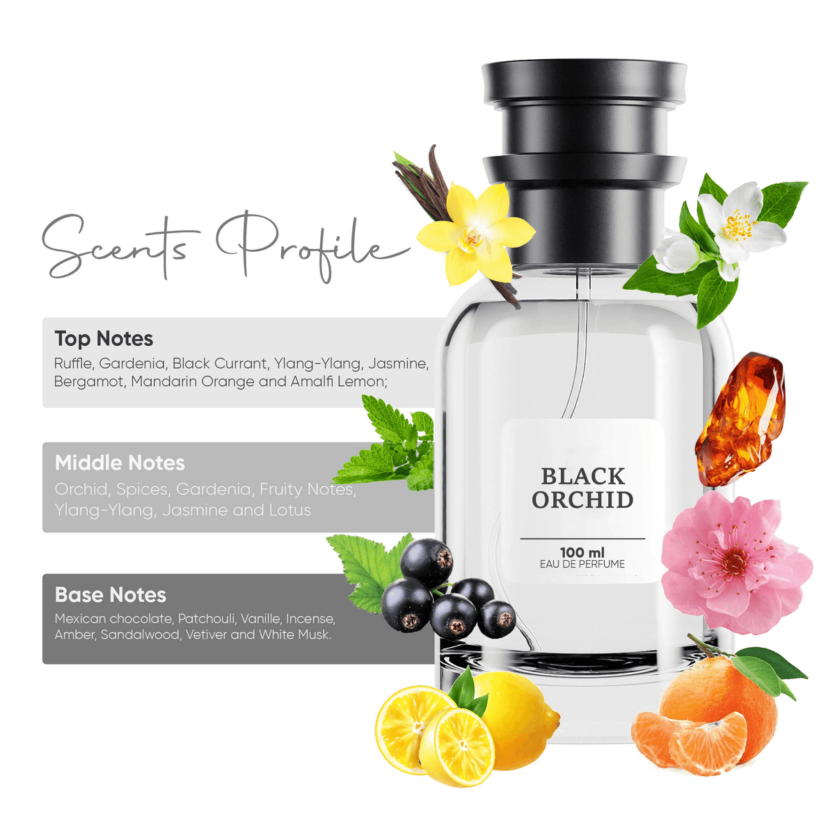 Top Notes : Truffle, Gardenia, Black Currant, Ylang-Ylang, Jasmine, Bergamot, Mandarin Orange and Amalfi Lemon